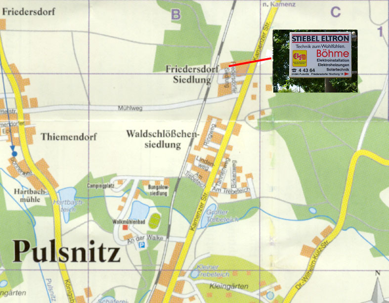 Von Kamenz kommend: hinter Ortseingangsschild Pulsnitz nach 30 m rechts abbiegen und Ausschilderung folgen